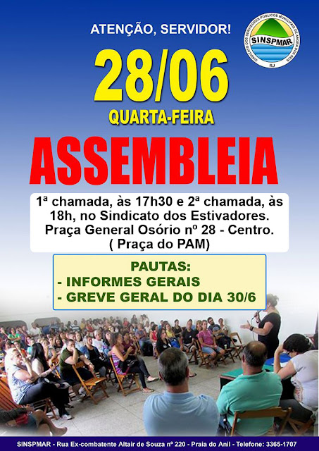 Evento realizado na sede do Sindicato dos Estivadores serviu para esclarecer dúvidas dos servidores; greve geral de sexta-feira também entrou em pauta A diretoria do Sindicato dos Servidores Públicos Municipais de Angra dos Reis – Sinspmar organizou na quarta-feira, 28 de junho, às 17h30, uma assembleia extraordinária com o intuito de fornecer aos servidores informações importantes sobre questionamentos do funcionalismo, assim como falar sobre a participação do sindicato na greve geral de sexta-feira, 30 de junho. O evento aconteceu na sede do Sindicato dos Estivadores, no Centro. A diretoria do Sinspmar, acompanhada do setor jurídico da entidade e do presidente da FESEP/RJ, Marco Correa, falou primeiramente sobre os questionamentos dos servidores quanto a diversos temas importantes como dissídio, PCCR, insalubridade e horas extras atrasadas – até dezembro de 2016 –, entre outros. O Sinspmar entrou com uma ação indenizatória cobrando as diferenças de reposição infl...